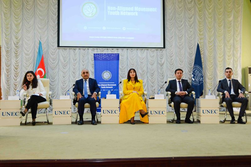 UNEC rektoru professor Ədalət Muradov rəqəmsal texnologiyaların cəmiyyətdə yaratdığı köklü dəyişikliklərdən söz açaraq, gənclərin bu istiqamətdə aparıcı qüvvə olduğunu deyib. Rektor Prezident İlham Əliyevin imzaladığı “Qoşulmama Hərəkatına üzv dövlətlərin vətəndaşlarına Azərbaycanın ali təhsil müəssisələrində təhsil üçün qrantların verilməsi haqqında” Sərəncamın önəminə diqqət çəkib, UNEC-də QH-na üzv olan 5 ölkədən 6 tələbənin bakalavr və magistratura pilləsində, bir nəfərin isə doktorantura təhsili aldığını bildirib. Ədalət Muradov Qoşulmama Hərəkatına gənclərin təşviqini artırmaq məqsədilə UNEC-də QHGŞ-nın nümayəndəliyinin açılmasını, eləcə də QH-nın fəaliyyətinin tədqiq edilməsi üçün tədqiqat mərkəzinin yaradılmasını və hər il QH-na üzv ölkələrdən bir nəfər doktorantın universitet büdcəsi hesabına UNEC-də təhsil alması barədə təkliflərlə çıxış edib.