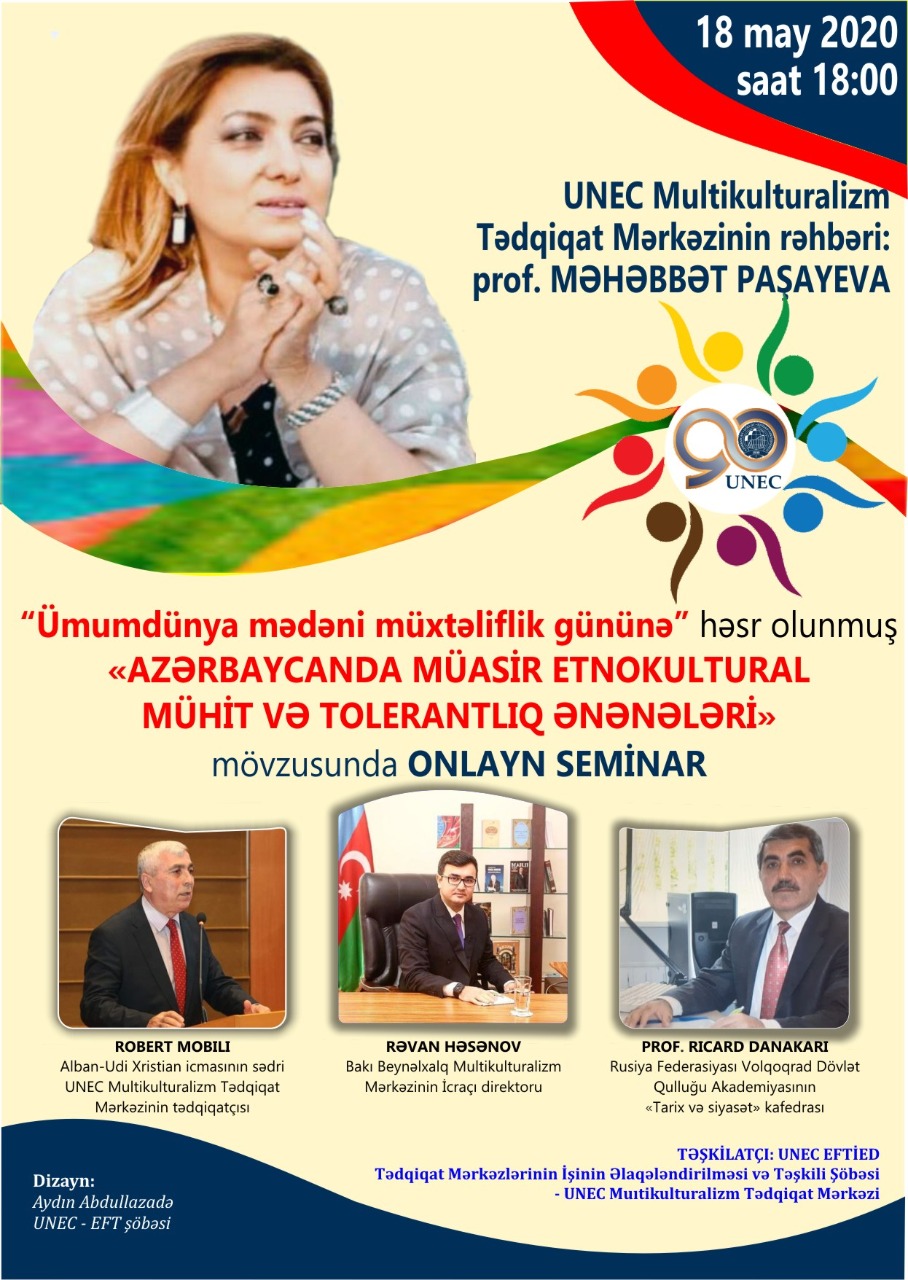 UNEC Multikulturalizm Mərkəzinin 18 may 2020-ci il tarixində saat 18.00-da Ümumdünya mədəni müxtəliflik gününə həsr olunmuş «Azərbaycanda müasir etnokultural mühit və tolerantlıq ənənələri» mövzusunda onlayn elmi seminarı keçiriləcəkdir.