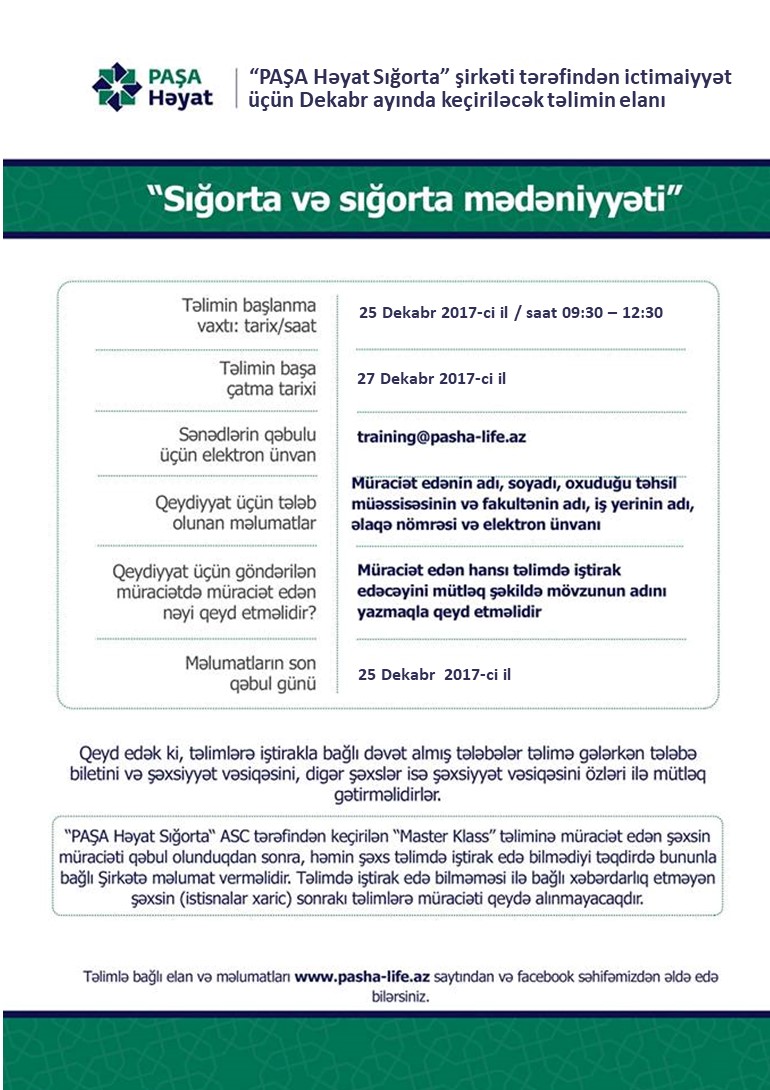 "Sığorta və sığorta mədəniyyəti" Təlimin başlanma vaxtı: 25 dekabr 2017-ci il / saat 09.30 - 12.30 Təlimin başa çatma tarixi: 27 dekabr 2017-ci il