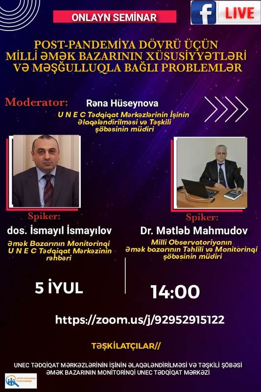 Əmək Bazarının Monitorinqi UNEC Tədqiqat Mərkəzinin təqdimatında "Post-pandemiya dövrü üçün milli əmək bazarının xüsusiyyətləri və məşğulluqla bağlı problemlər" mövzusunda onlayn seminar keçiriləcək.