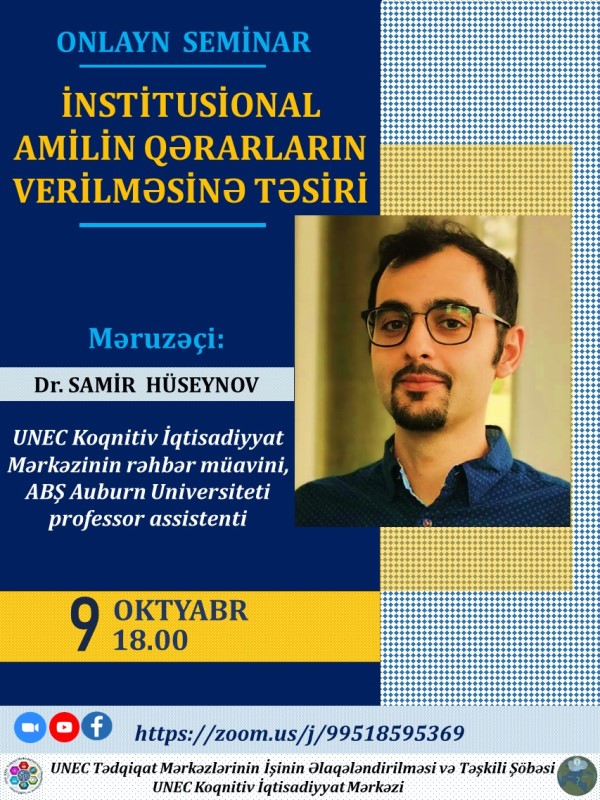 UNEC-də Koqnitiv İqtisadiyyat Mərkəzinin rəhbər müavini, ABŞ Auburn Universitetinin Aqrobiznes ve Eksperimental İqtisadiyyat üzrə professor assistenti Samir Hüseynovun təqdimatında “İnstitusional amilin qərarların verilməsinə təsiri” mövzusunda onlayn seminar keçiriləcək.