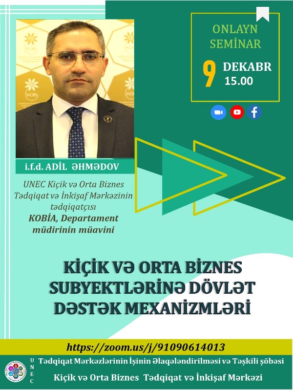 Mövzu ətrafında UNEC Kiçik və Orta Biznes Tədqiqat və İnkişaf Mərkəzinin tədqiqatçısı, KOBİA Departament müdirinin müavini i.f.d. Adil Əhmədov təqdimatla çıxış edəcək.