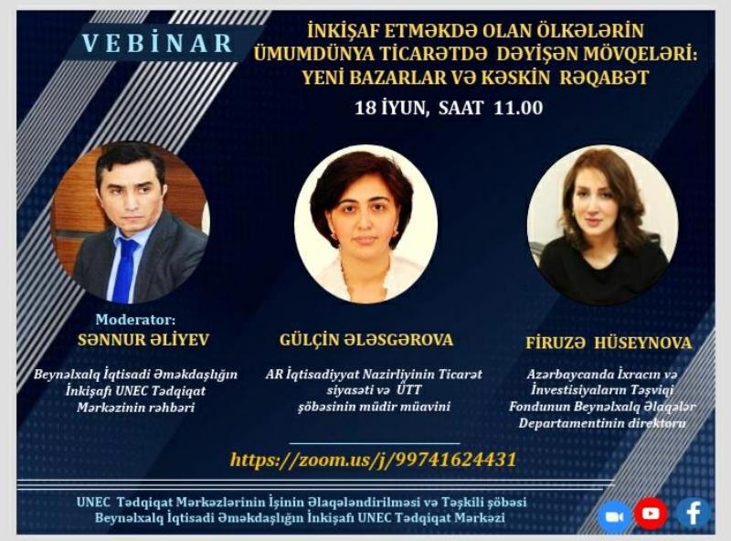 UNEC-də “İnkişaf etməkdə olan ölkələrin ümumdünya ticarətdə dəyişən mövqeləri: Yeni bazarlar və kəskin rəqabət” mövzusunda vebinar keçiriləcək.